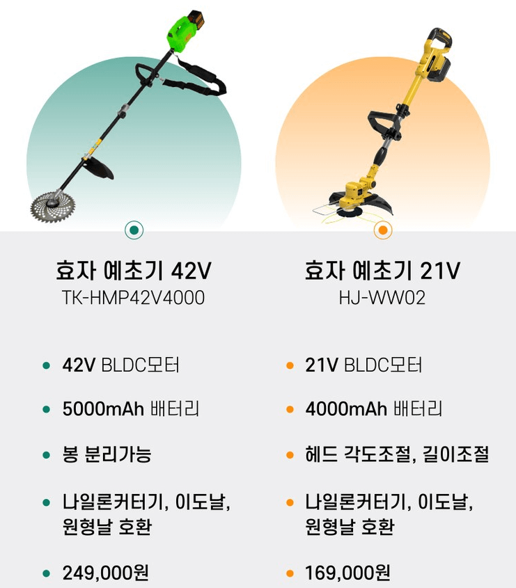 가벼운 충전식 예초기로 추천드릴 제품은 효자 충전식 전동 TK-HMP42 V4000입니다. 큰 배터리 용량과 파워로 두꺼운 줄기의 작은 나무까지 정리가 가능한 제품입니다.