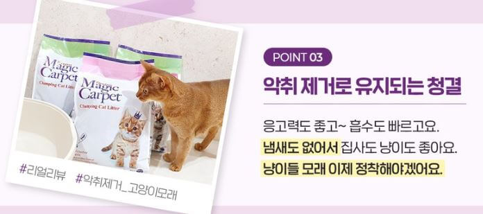 냄새 안나는 고양이 모래로 추천드릴 제품은 매직카펫 고양이 모래입니다. 해당 제품은 응고력이 좋아 냄새를 잘 잡아주고 사막화가 거의 없어 침실에 고양이 화장실을 두는 집사에게는 인생템이 될 수 있겠네요.
