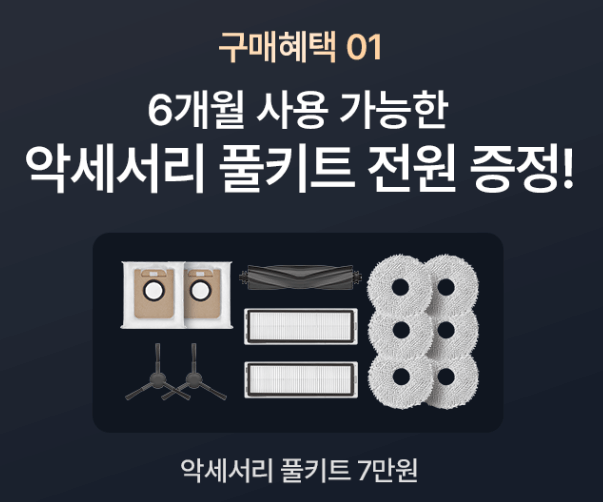 드리미 로봇청소기는 사전예약 기간에 예약구매 하는 분들에게 6개월치 액세서리 풀키트를 증정하고 드리미 사전예약 홈페이지에 구매인증 시 1만 원 상당의 기프티콘을 증정한다고 합니다.