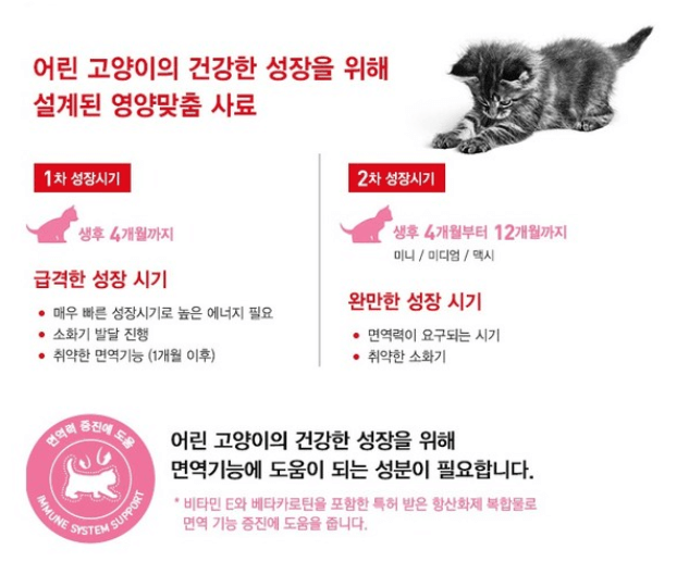새끼고양이 사료는 폭발적인 성장시기에 먹이는 것이 좋은데요. 보통 키튼이라 불리는 아기고양이 시기는 생후 12개월 미만을 일컫습니다.